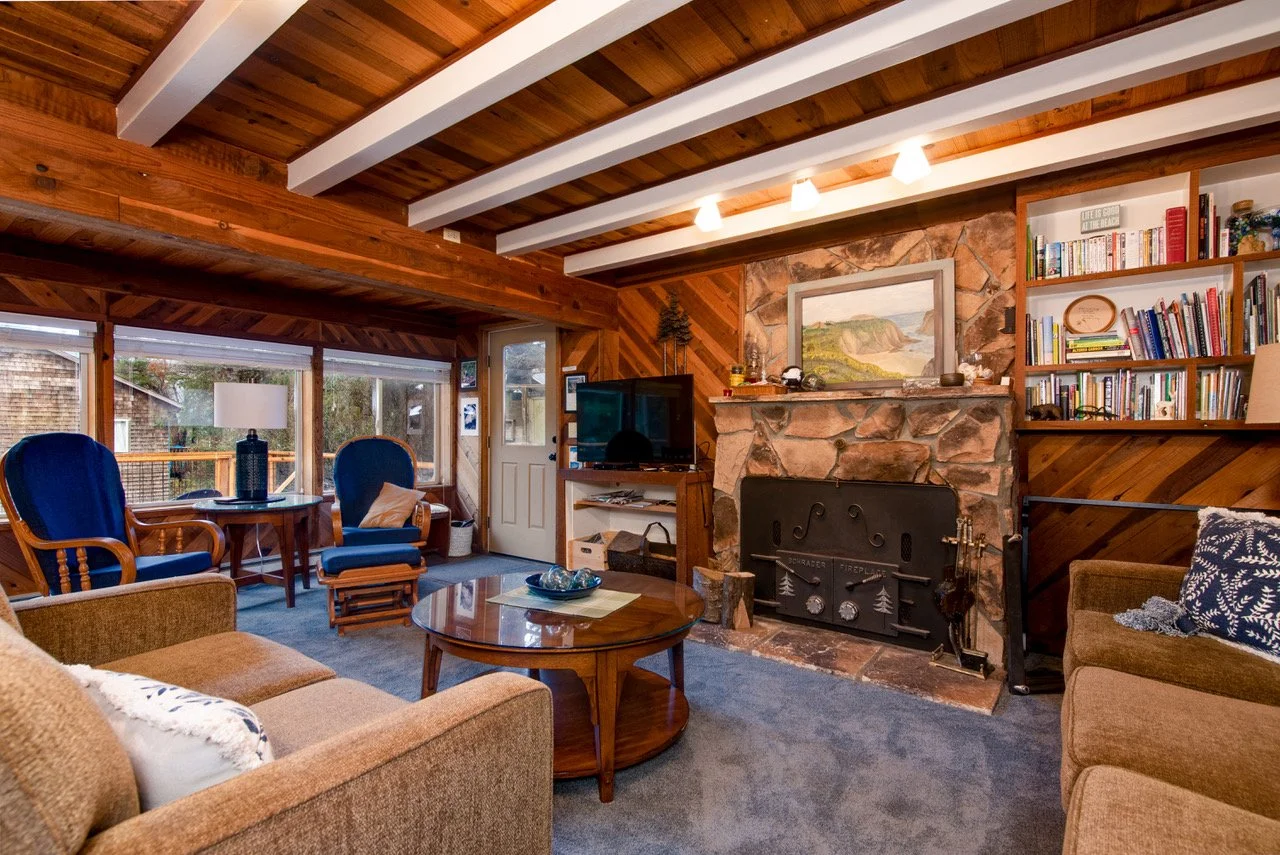 The large living room has a fireplace, wood, books, and games. Two bedrooms on the main level have double beds. One bedroom upstairs has a king sized bed and the other has three twin beds. Two full baths are equipped with towels and toiletries. Use the fully equipped kitchen. Extra kitchen items are located in the closet off the bedroom off the kitchen. A Family Room is located in the basement. The washer and dryer, beach toys and a assortment of tools are located there as well.